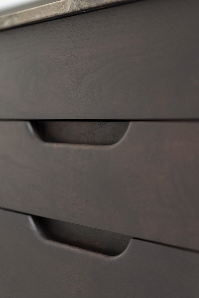 A fully bespoke vanity forms the centrepiece of the room. Storage was tailored precisely to the client, down to the height of individual drawers.