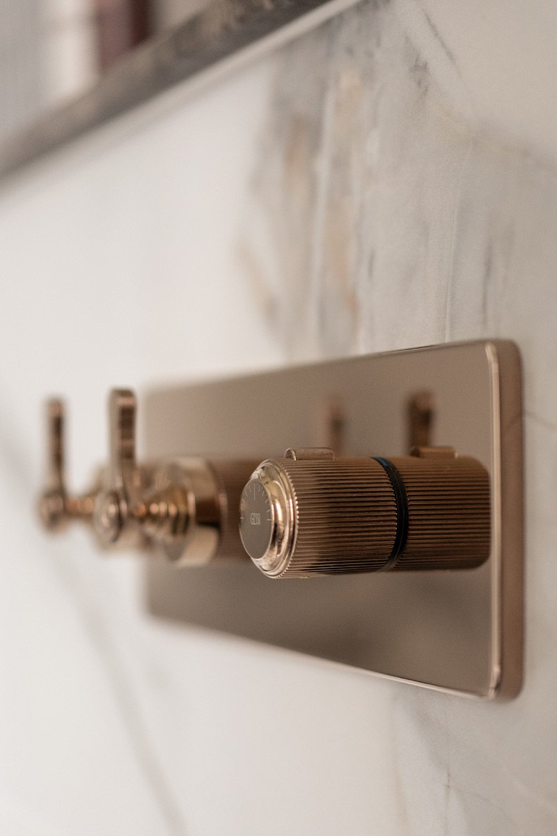 The shower enclosure combines practicality with refinement. A hand-crafted fluted glass screen provides privacy without enclosing the space and is positioned to suit the client’s sightlines.