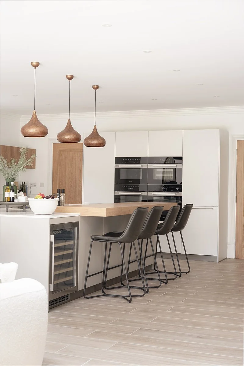 We began with a base of soft grey cabinetry to anchor the room in a contemporary yet neutral aesthetic. This was paired with oak-effect accents, used sparingly but deliberately, to introduce warmth and depth without detracting from the kitchen’s clean, modern composition.