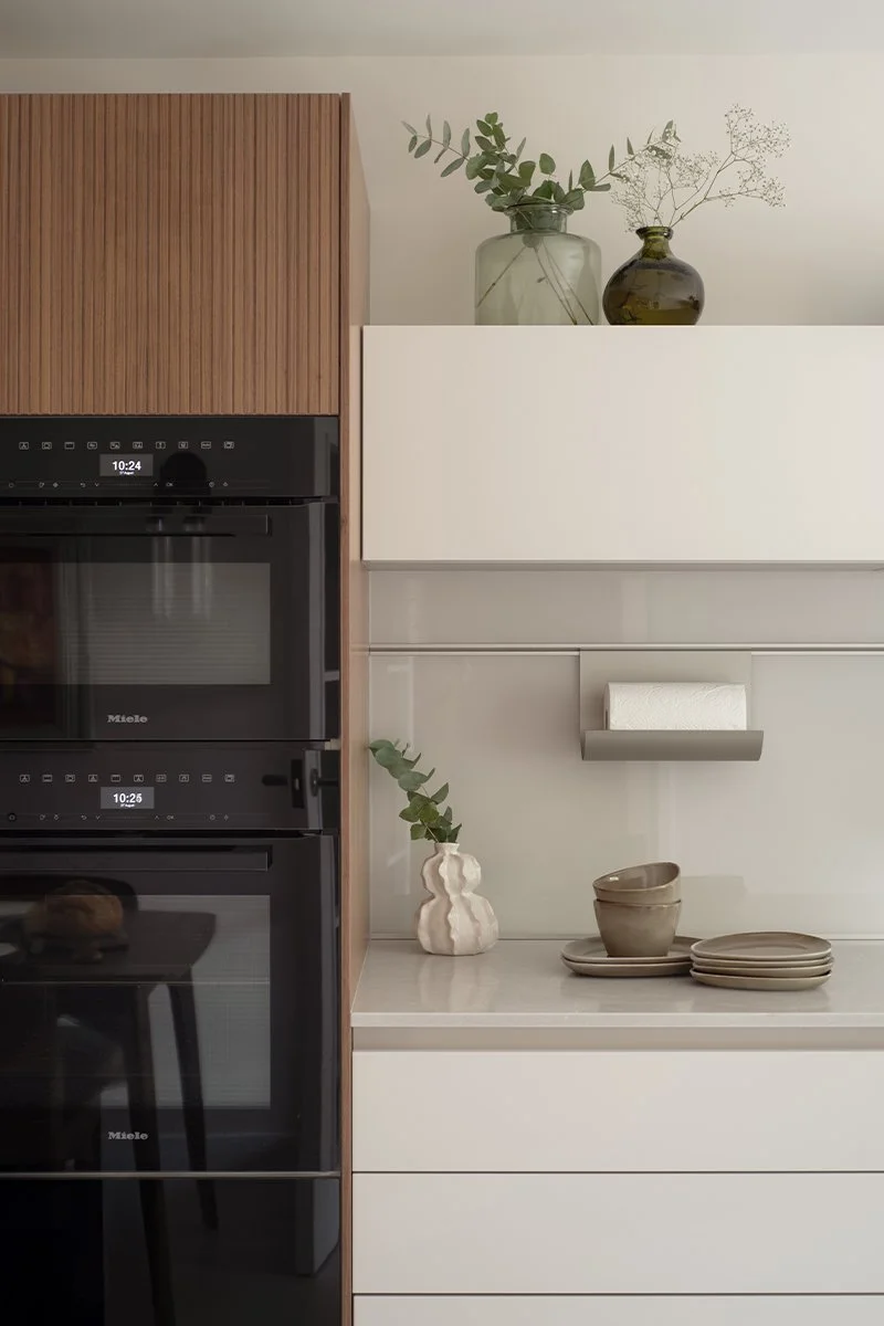 The client, originally from Scandinavia, envisioned a kitchen of muted tones, layered textures, and the warmth of natural wood — minimal, calm, and beautifully practical.